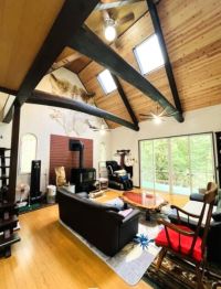 - 太い梁と勾配天井が印象的なリビング・薪ストーブ付