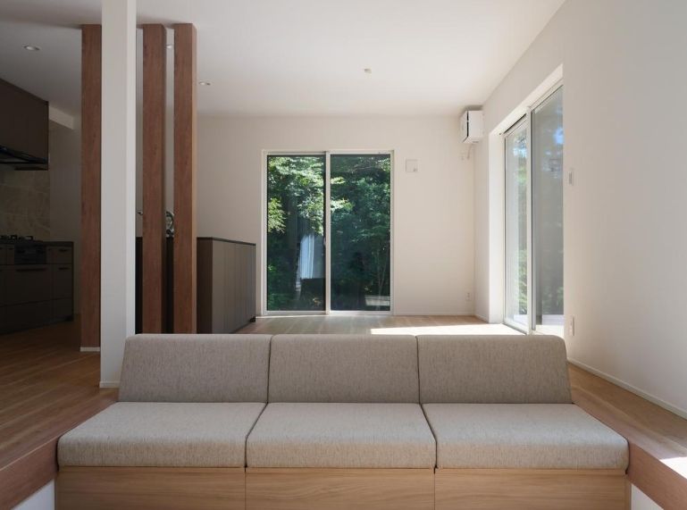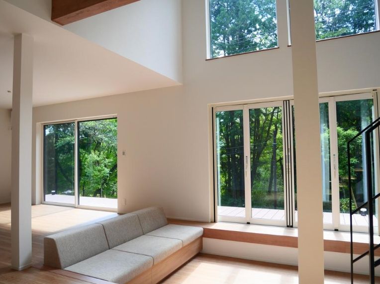 吹抜けリビングには大きな窓を設け、四季折々に表情を変える森林ビューを堪能できます。