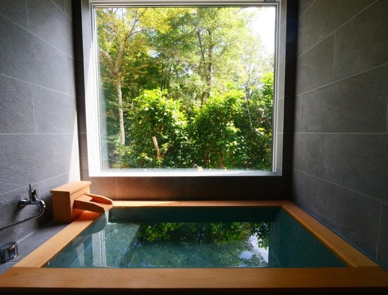 温泉付きの浴室では、自宅にいながら箱根の名湯を満喫。
