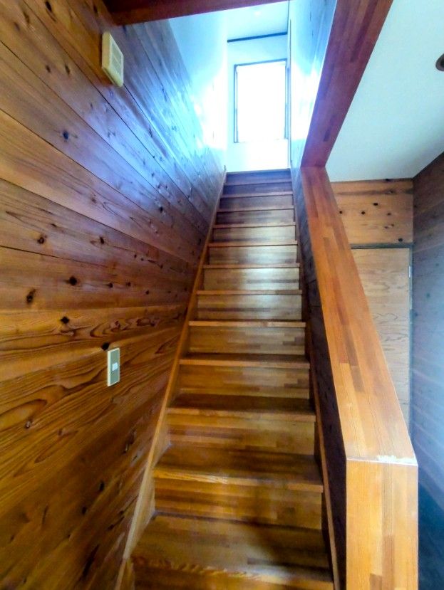 - 板張りの吹き抜け、薪ストーブが印象的なリビング・木のぬくもりを感じる無垢材仕上げの内装