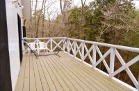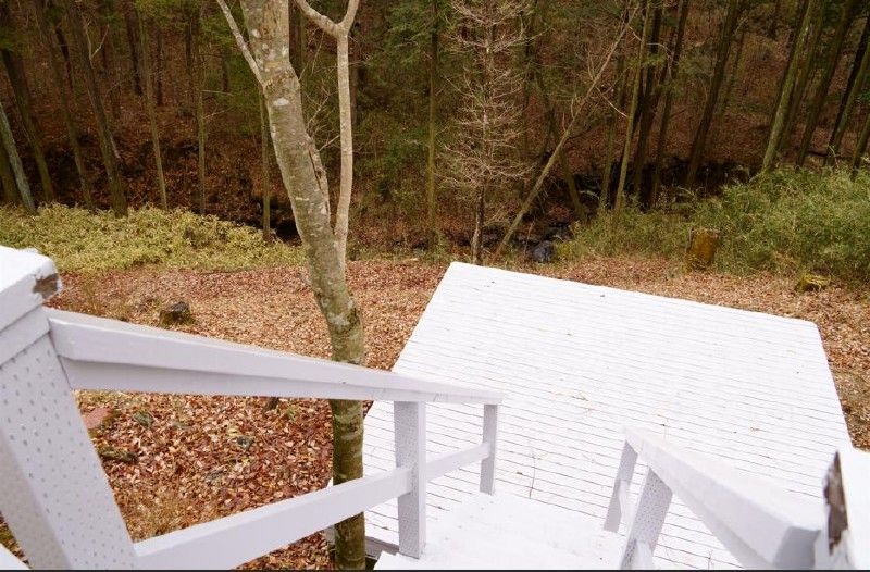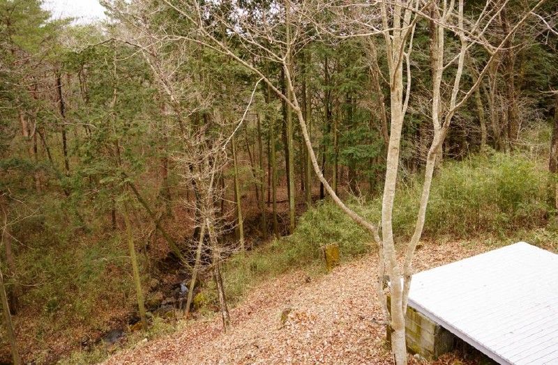広いウッドデッキで、小川の水音を聞きながらリラックス。