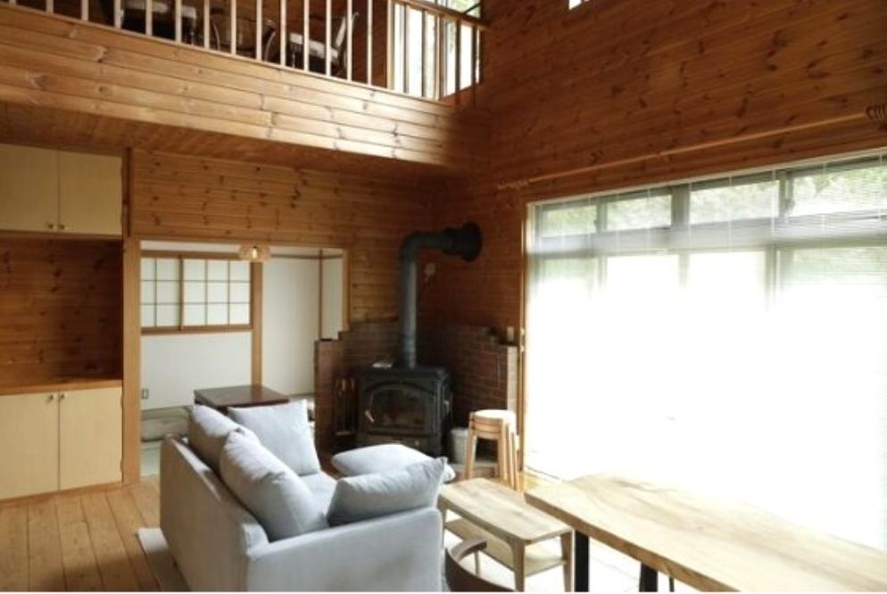 吹き抜けのある開放的なリビングには薪ストーブを完備しています。自然素材を活かした室内空間に加え、ウッドデッキや東屋から景色を楽しめる、別荘らしい贅沢な造りです。