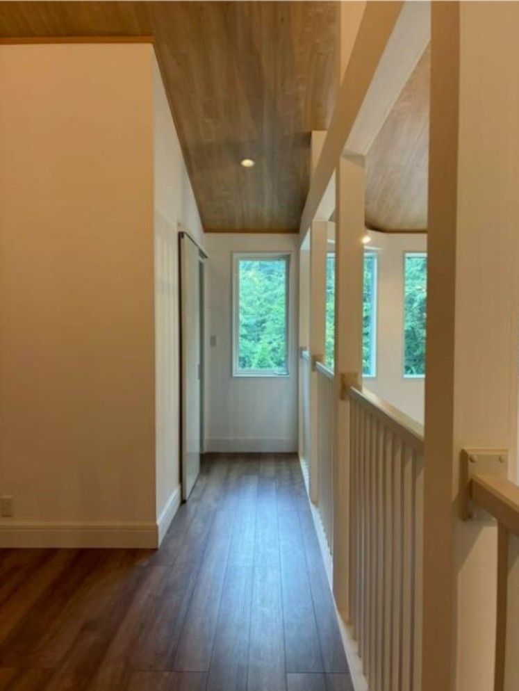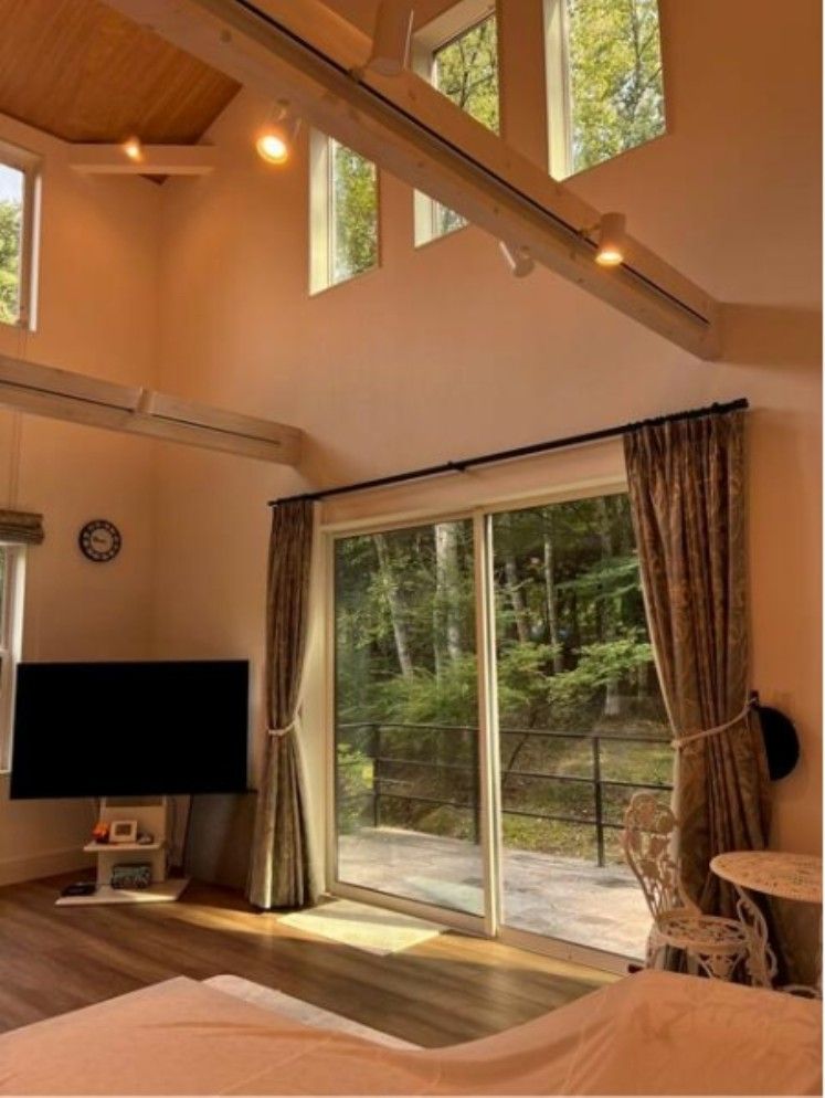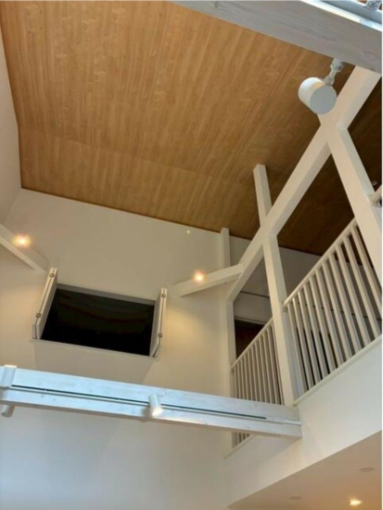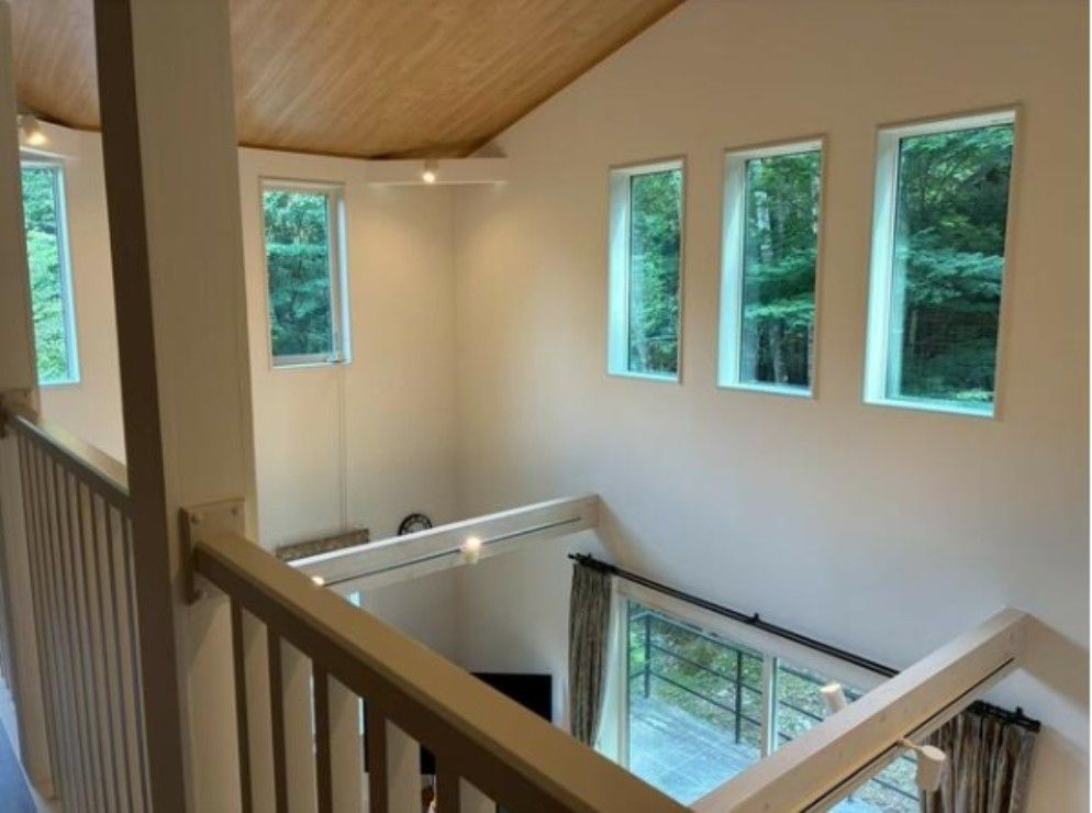 - リビングの吹き抜けに6つのFIX窓が付いている明るい室内