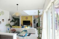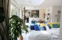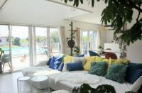 リビングは大きな窓から自然光が差し込み、プールを眺めながらリゾートホテルのようにリラックスできる空間です。