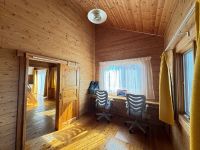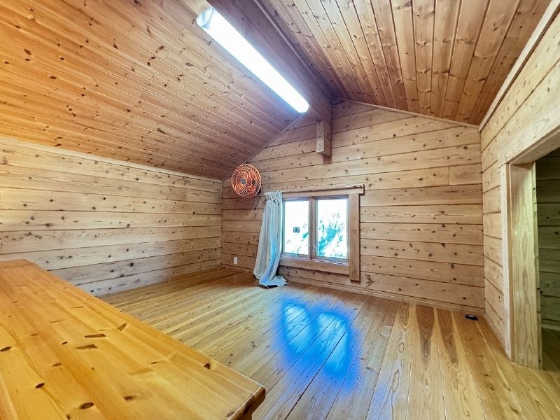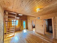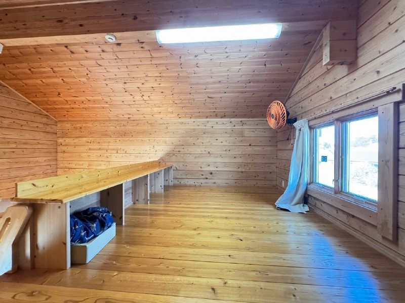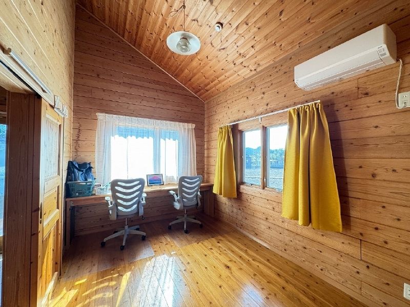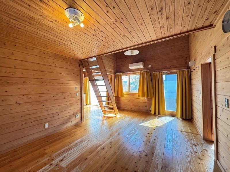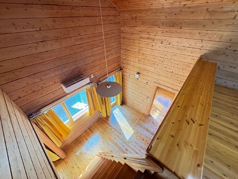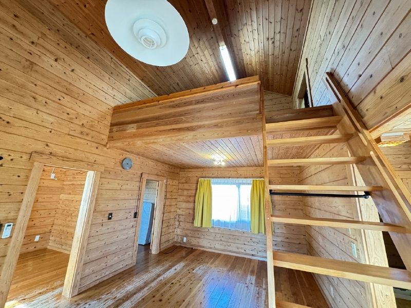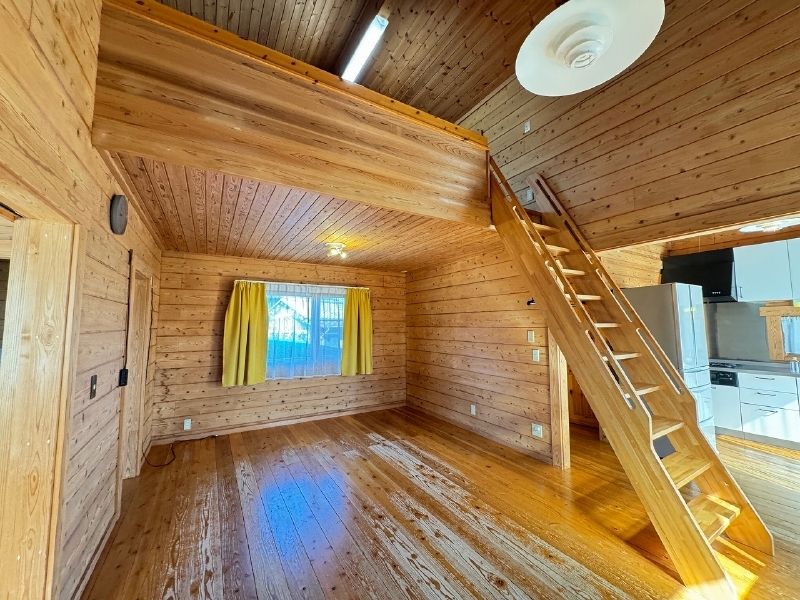 吹き抜けを通して1階と2階がつながる開放的な設計が、ログハウスならではの心地よさを一層引き立てます。