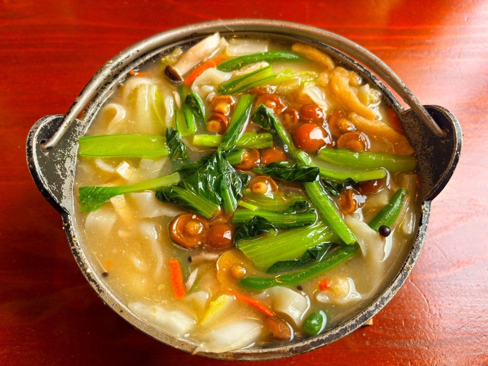そしてその後すぐに「野菜ほうとう」の登場!二人前あるのではないかというボリュームです。野菜があふれんばかりに入っていて驚きます。さて気になるシルクほうとうですが、平打ち麺なのですがヒラヒラとした感じで少し縮れています。ほうとうというと太くて固めの平打ち麺の印象ですが、それとはまた違っていてつるんとした口当たりで柔らかくなめらかな食感なのでするするいけます。醤油と味噌のバランスがよいスープが野菜と麺にしっかりとなじんでいました。