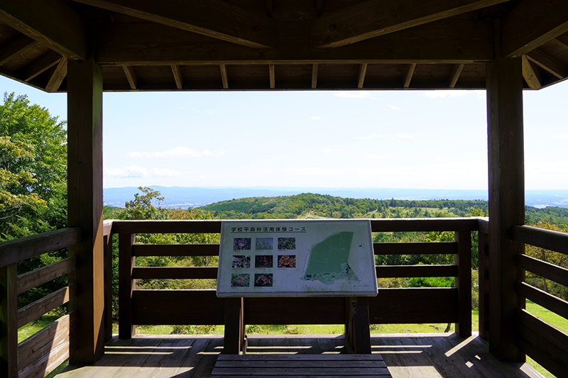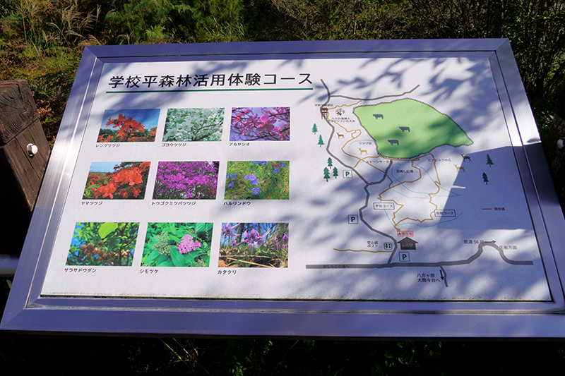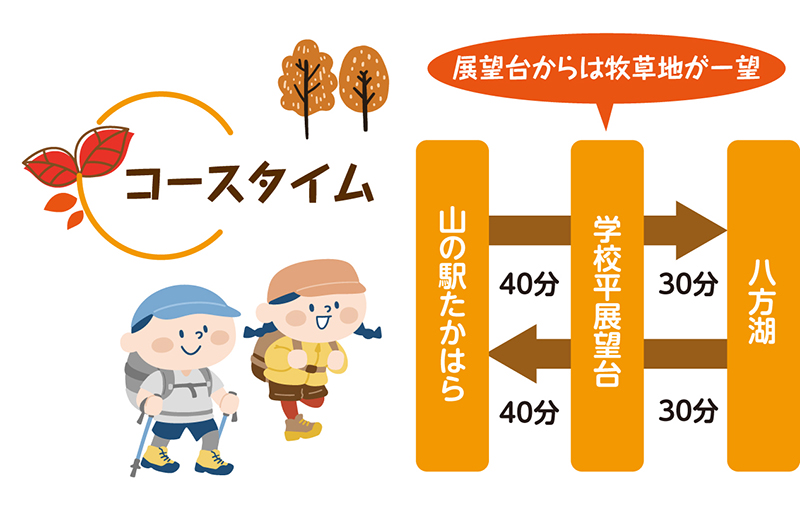 「山の駅たかはら」からスタートし、散策路を巡り「学校平展望台」、そして「八方湖」へ。