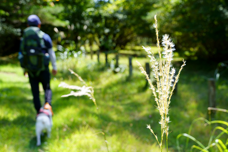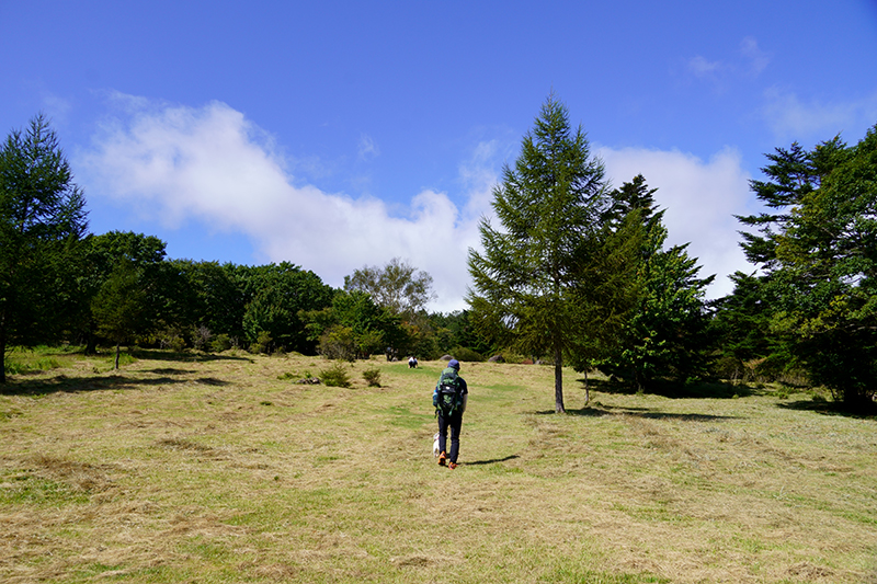 吸いこまれそうなほど、澄み切った秋晴れの空。足元には草が茂り、ふわふわの散策路を気持ちよく歩けます。