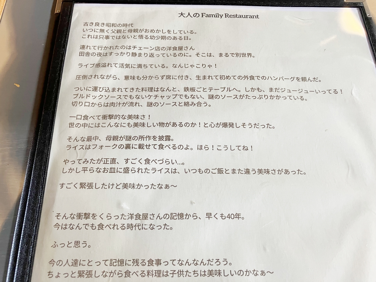 メニューには、店長さんのレストランへの思いが綴られたページもあります。洋食屋さんのワクワク感。ファミリーレストランや外食が楽しみで仕方のなかった頃を思い出しますね。