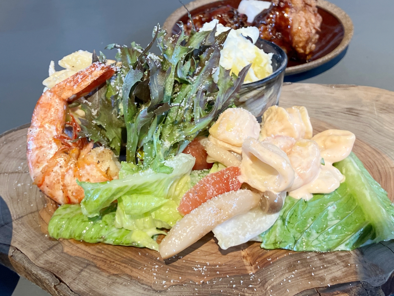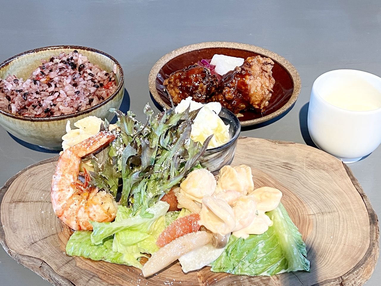 いろいろなDELIをちょこっとずつ味わえるDELI御膳。今回は海老やポテトサラダ、マカロニサラダなどが乗っているプレートです。主菜はマニスチキンを選びました。