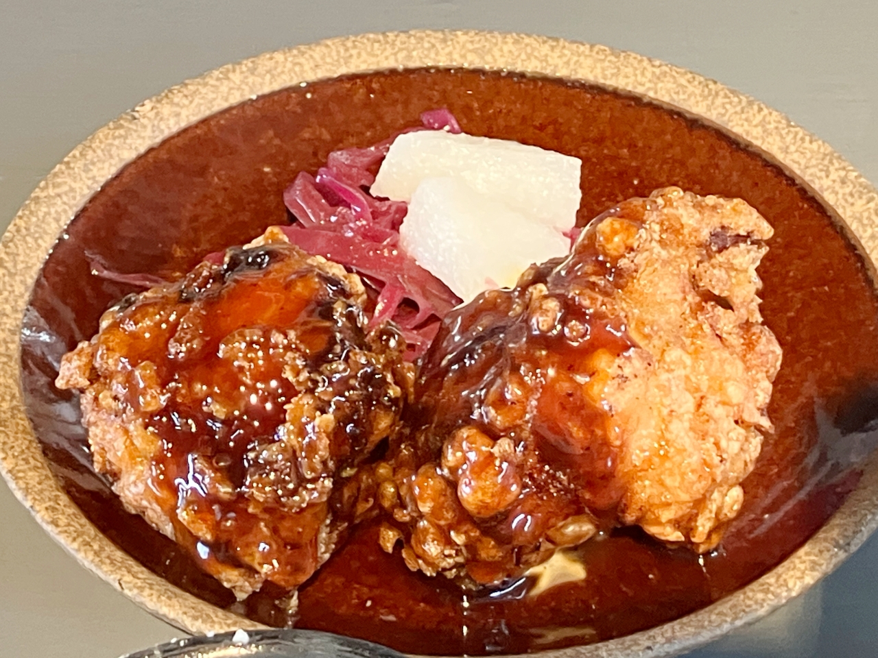 ジューシーで柔らかなマニスチキン。紫キャベツと長芋の酢漬けと一緒にいただきます。