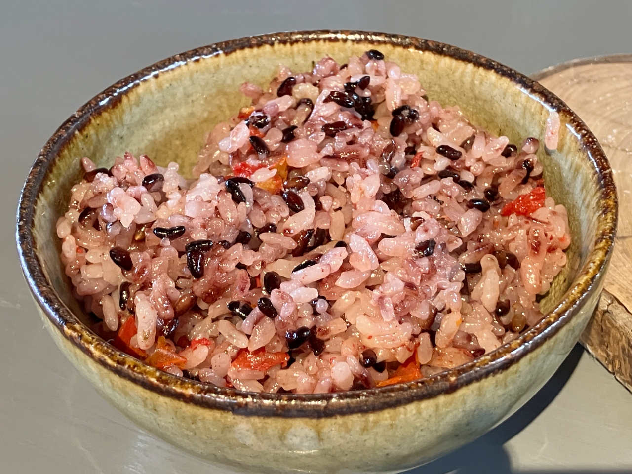 こだわりの黒米の炊き込みご飯はドライトマトが入った一品でした。艶やかな炊き上がりで食欲をそそります。