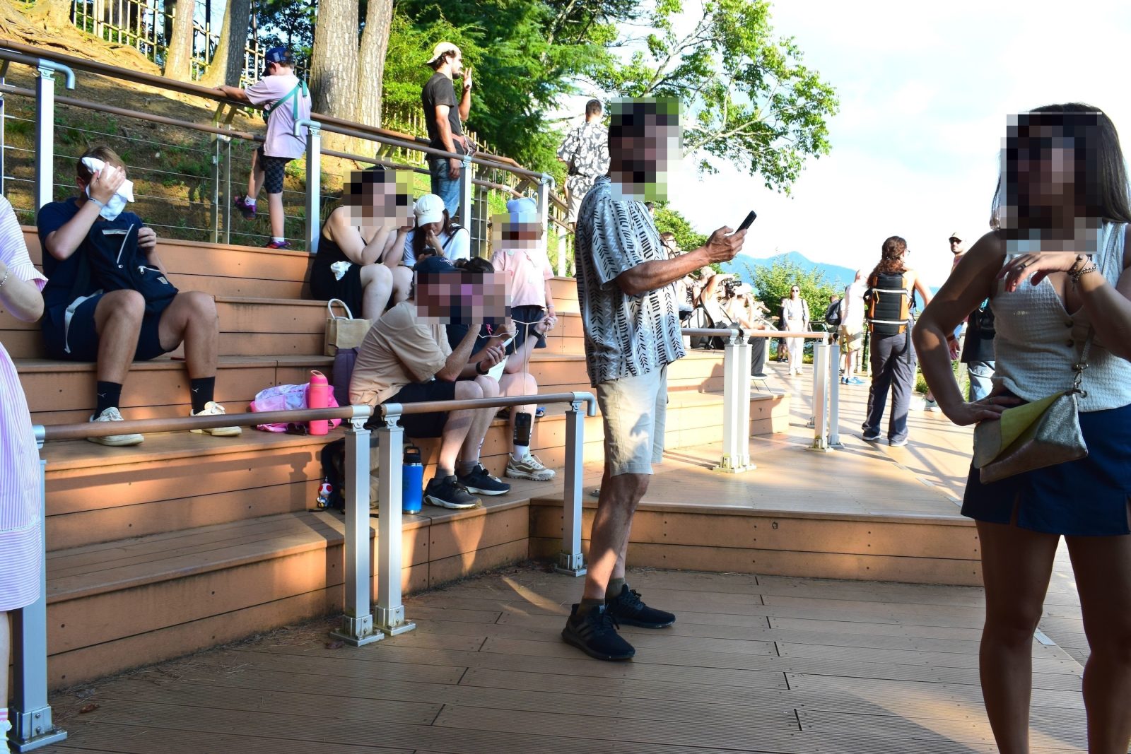 デッキは階段上になっていて休憩をしたり、写真撮影をしたりと思い思いに富士山を堪能。晴れた日であればこのように富士山の絶景をのぞめるスポットです。ちょっとがんばって登ってきた甲斐があったと思える景色がそこにはありました。