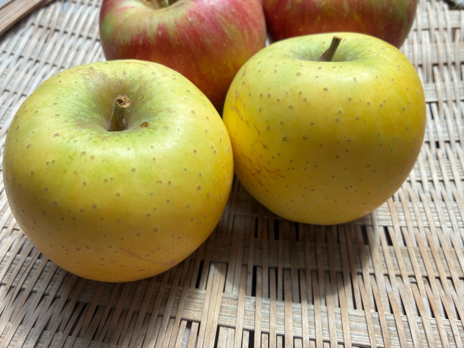 写真手前、シナノゴールドはゴールドというだけあって、色味が黄緑色のリンゴです。
