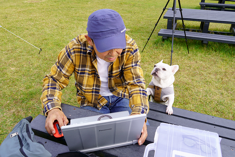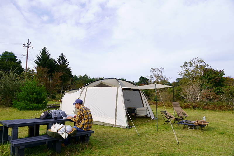テントの設営後は少しお仕事。ネット環境があれば、場所を選ばすお仕事ができる良い時代となりました。