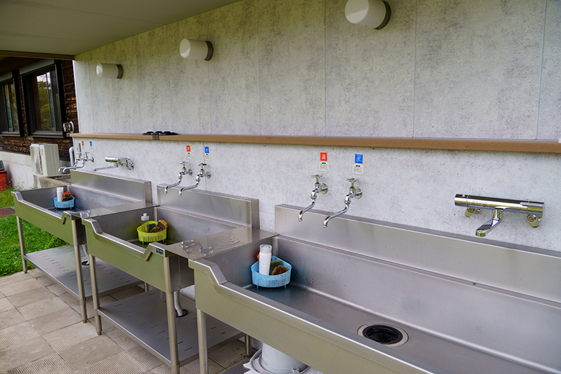 管理棟屋外に洗い場があります。とても綺麗で嬉しいことにお湯も出ます。