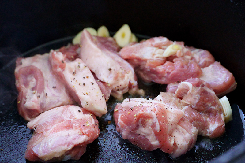 塩コショウした豚バラをニンニクとオリーブオイルで焼いていきます。