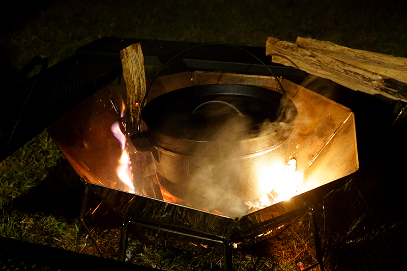 小さくなった焚火の上にダッチオーブンを乗せて、もうひと煮込み。