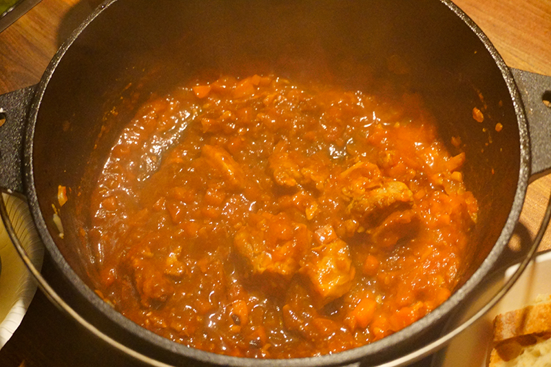 最後にコンソメとローリエ、ホールトマトを入れて煮込んでいきます。
