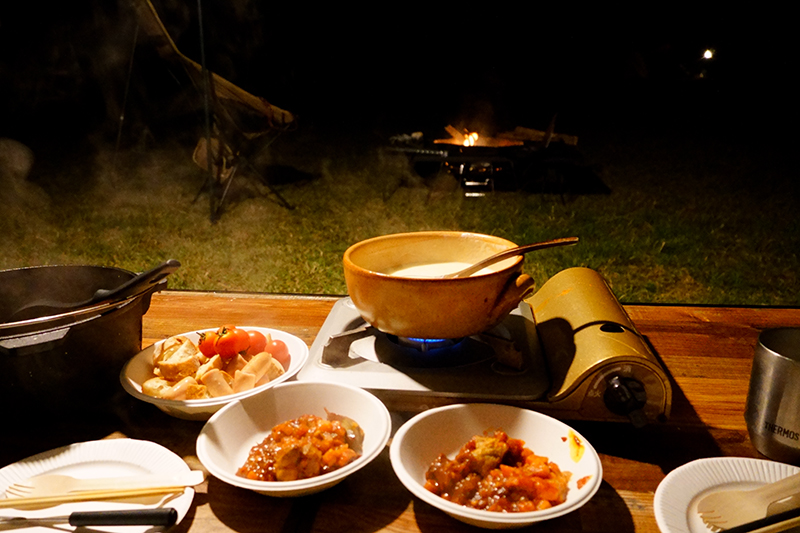 夫婦の会話が弾むのも焚火の効果ですね。煮込み料理が出来上がる1時間ほど会話とお酒を楽しみました。