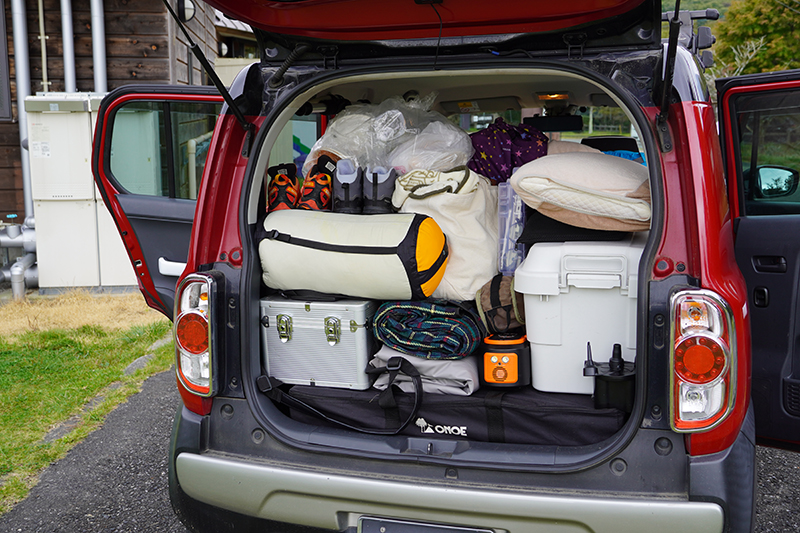 雨が降る前に無事に撤収できました。急いで運んだせいか、帰りは荷物がパンパンに。キャンプあるあるですね。