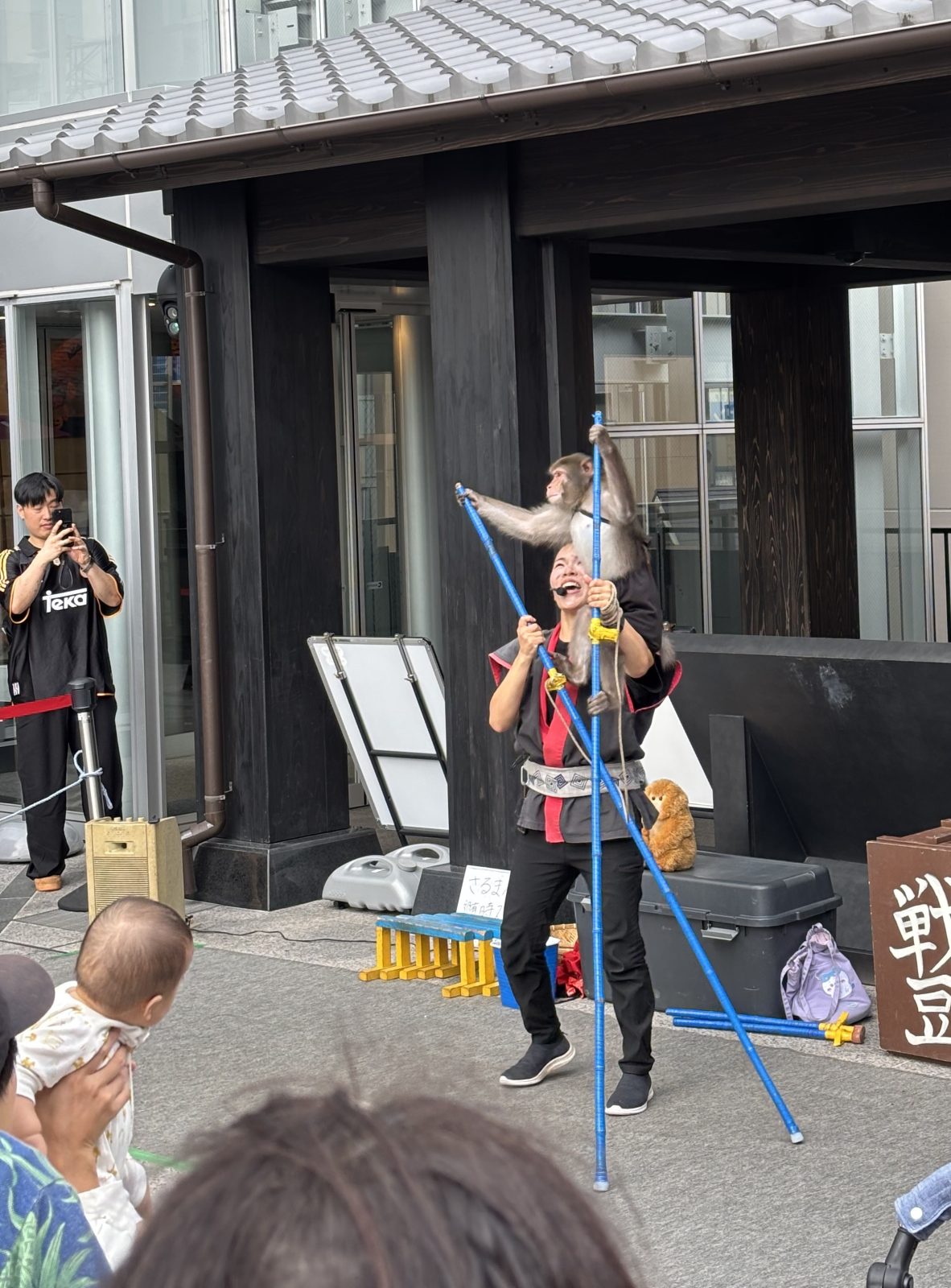 小田原駅改札を出て駅ビルのミナカ広場では猿回しの芸が披露されていました。