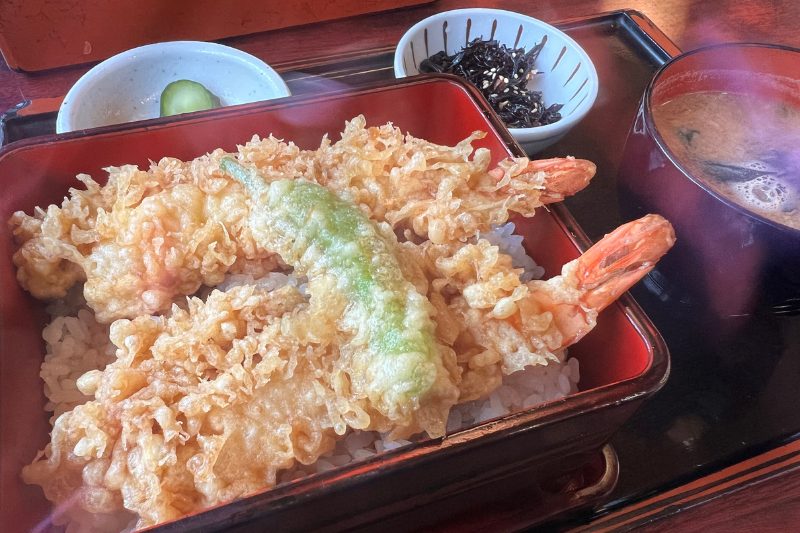 ふっくらと炊かれたご飯の上に、海老2尾とその上にはシシトウがありました。ほどよい甘さのタレが染み込んだ味わいは、旅の疲れを癒してくれるような優しさがありました。