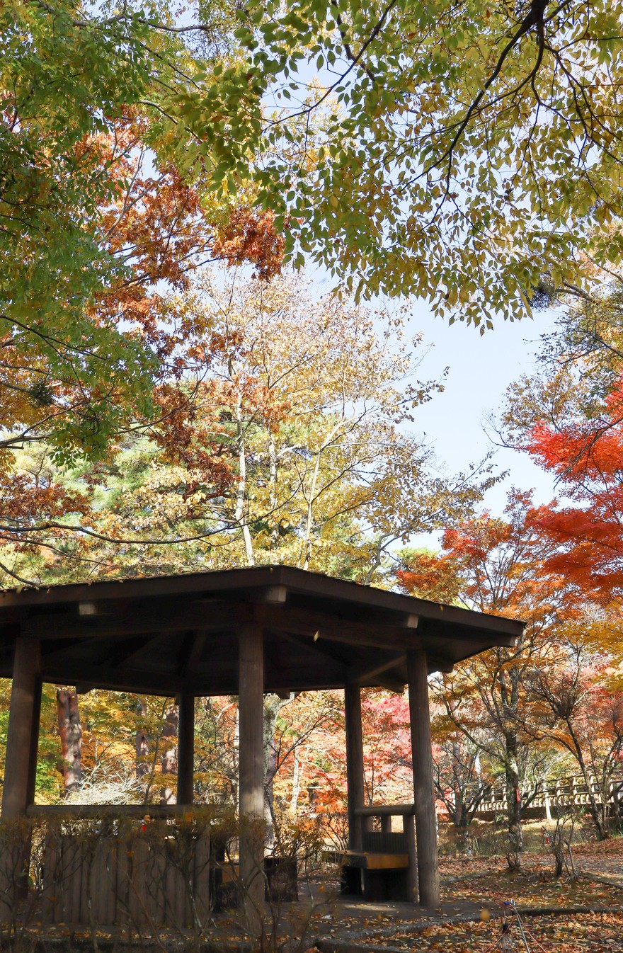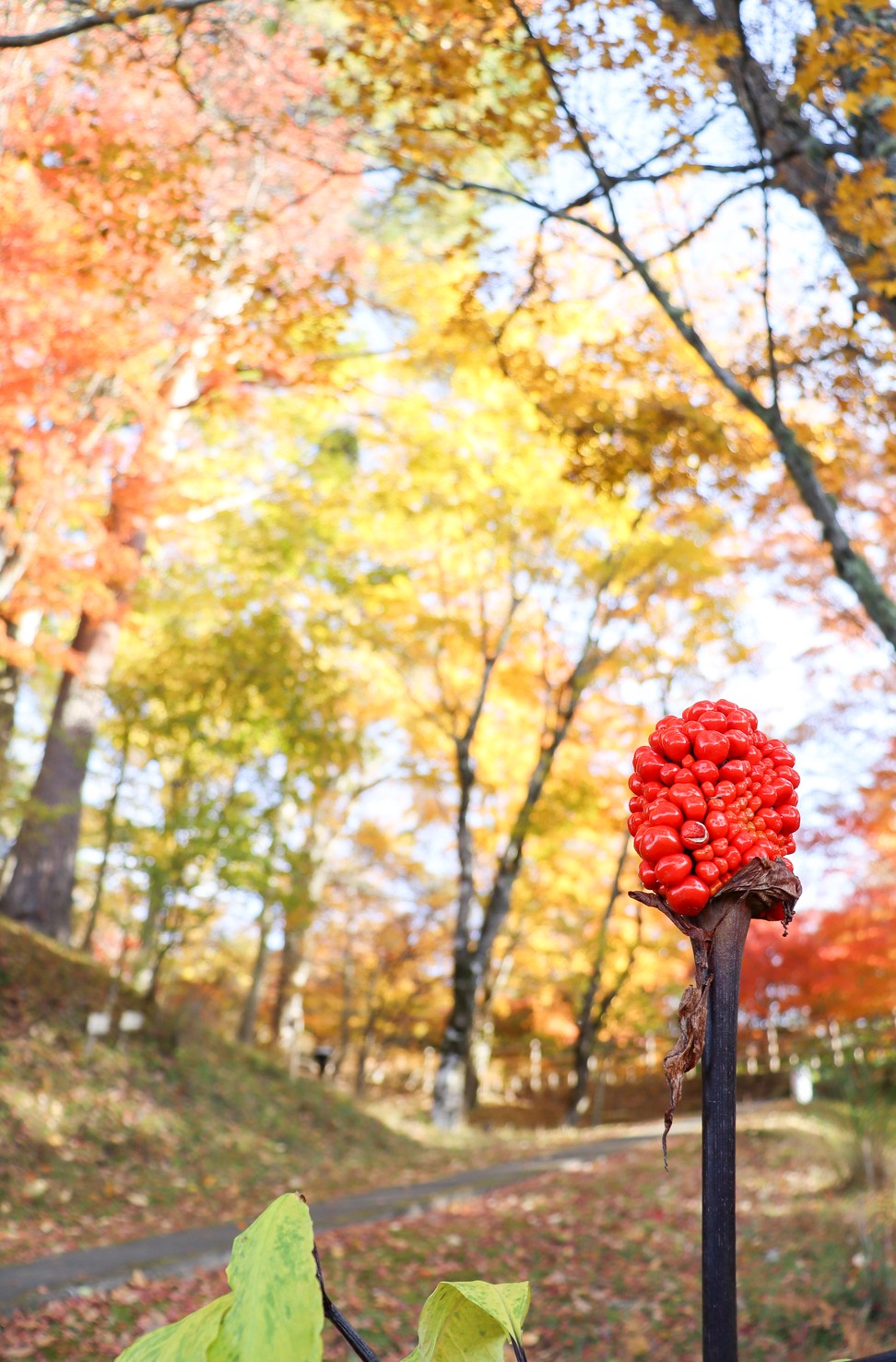 公園の散策路に入ってみると、今が盛りとばかりに美しく紅葉した木々に囲まれ、