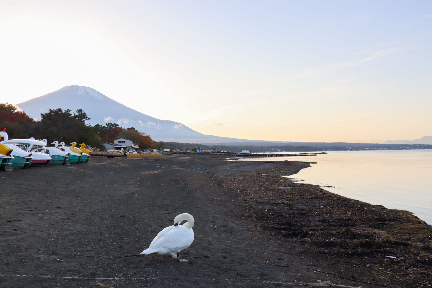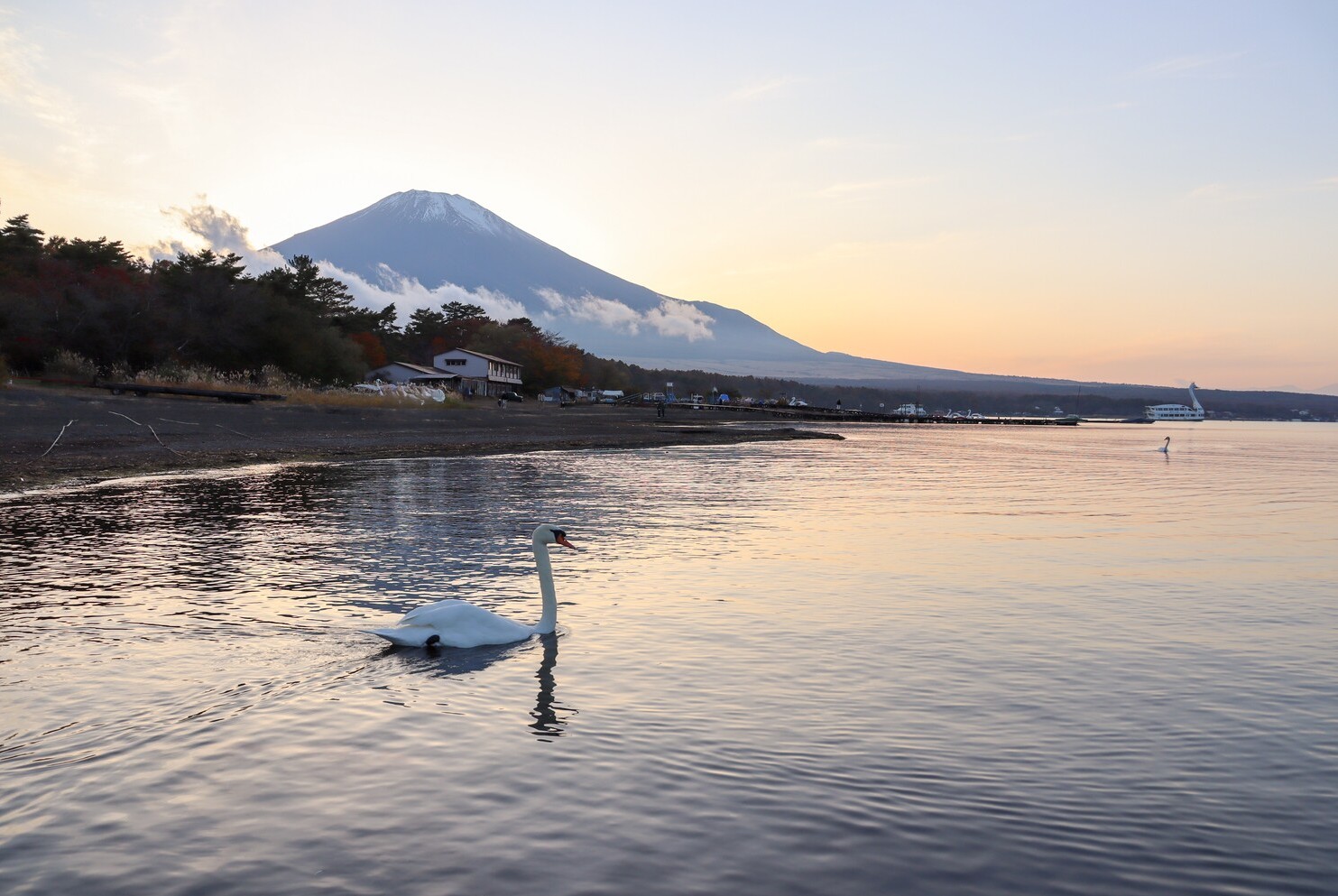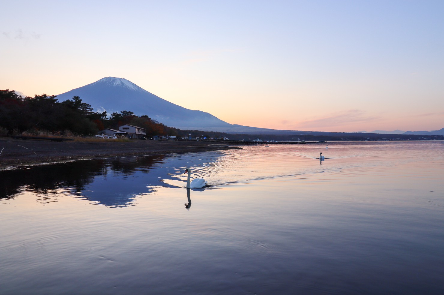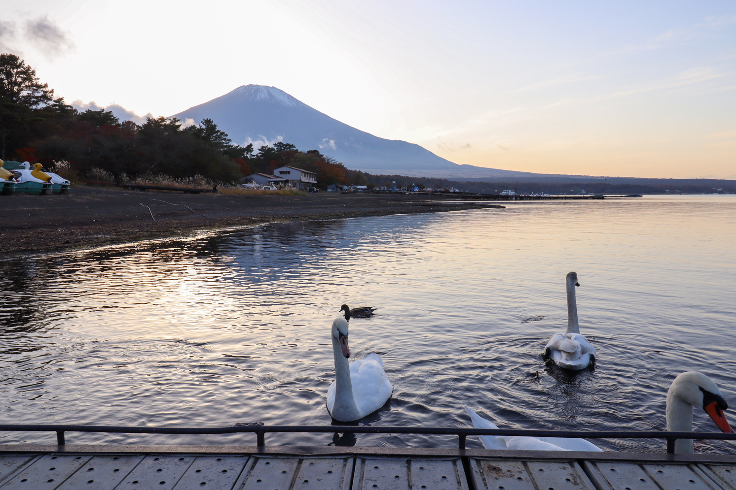 マジックアワーの山中湖と富士山と白鳥のコラボがステキすぎた…!