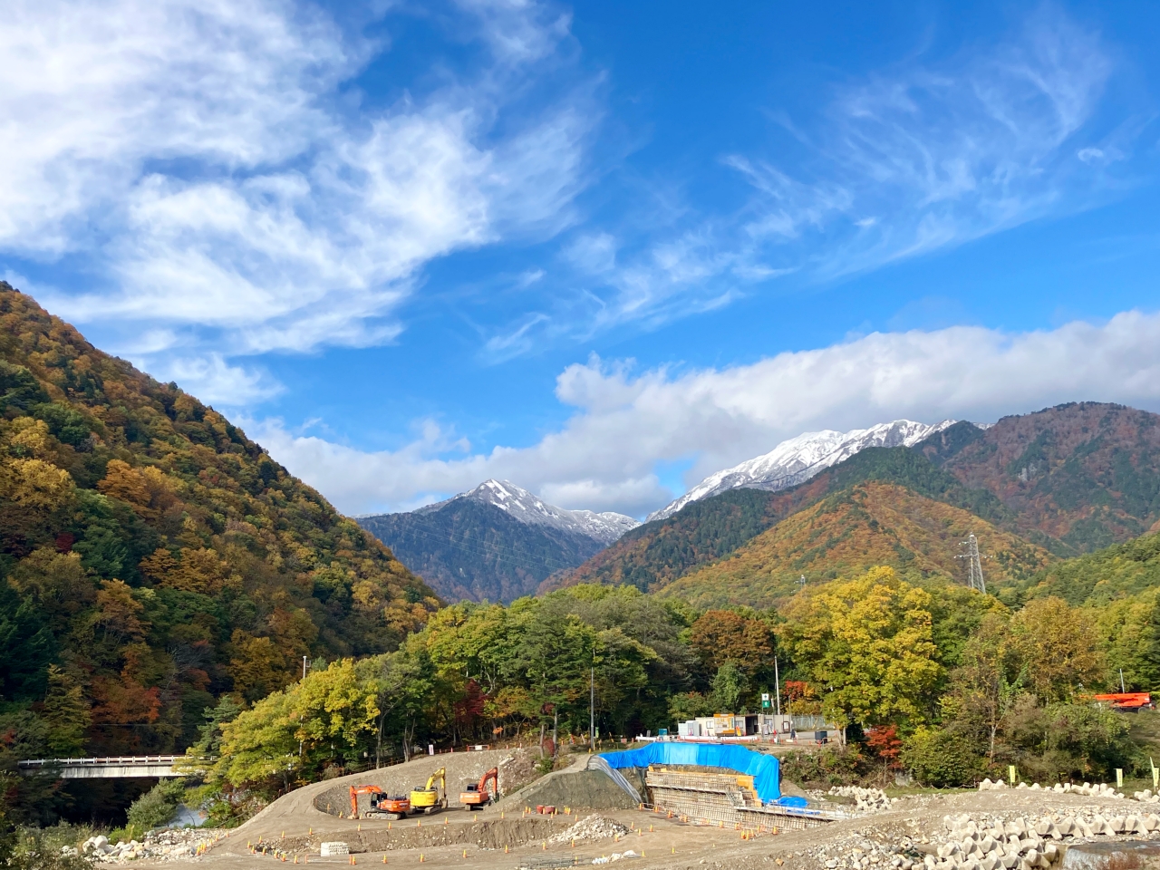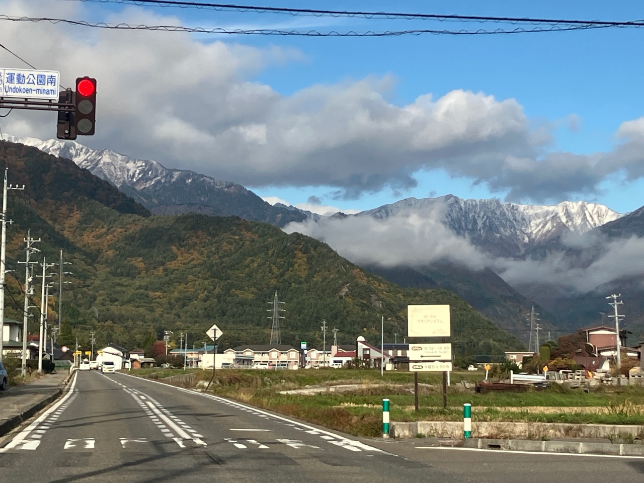 ちなみに高瀬渓谷へと向かう大町の街中も景色がとてもきれいなんです。遠くに見える里山も色づき、奥には雪山。見た目にはもっと色づいて見えるのですが、この日は太陽の加減で写真は少し落ち着いて見えています。