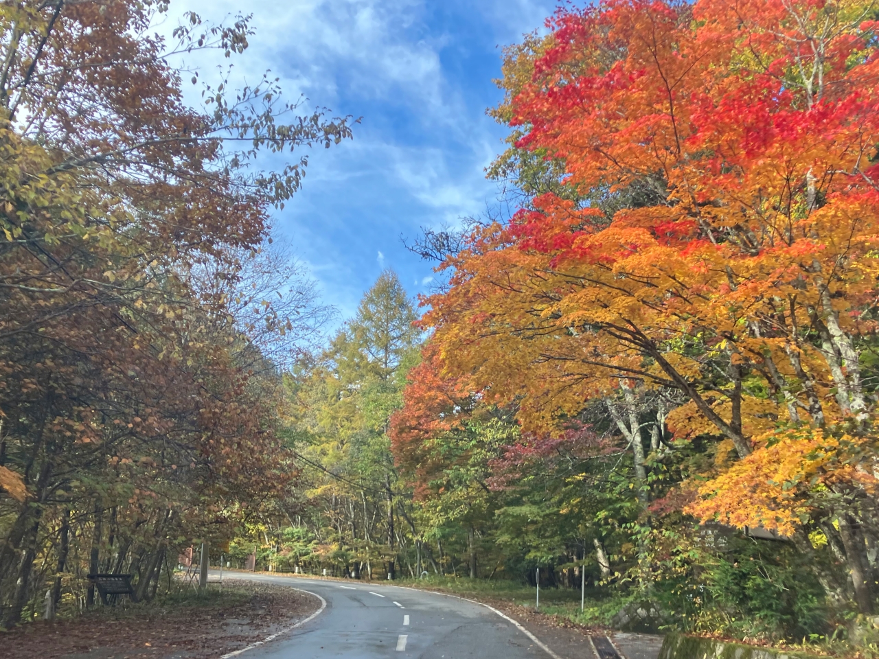 すでに外気は10度以下。この冷たい空気があるからこそ、木々はより鮮やかに色づいていくのですよね。道路沿いにも数々の紅葉スポットがあって、車で走るのがもったいないくらいです。
