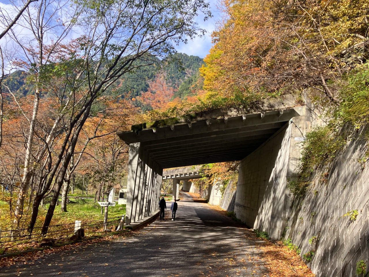 真っ暗なトンネルを出ると、そこは紅葉の広がります。高瀬ダム直前までの道はゆるやかな道路。紅葉を身近に感じながら奥へと進むことができます。