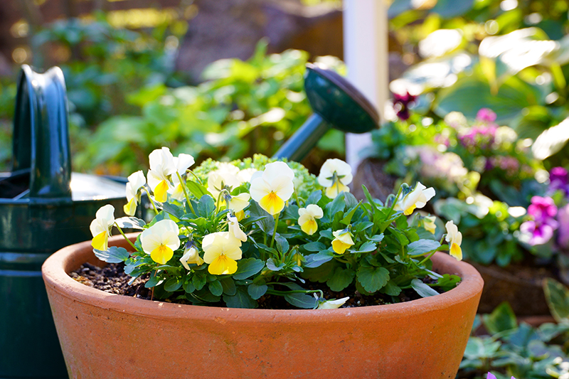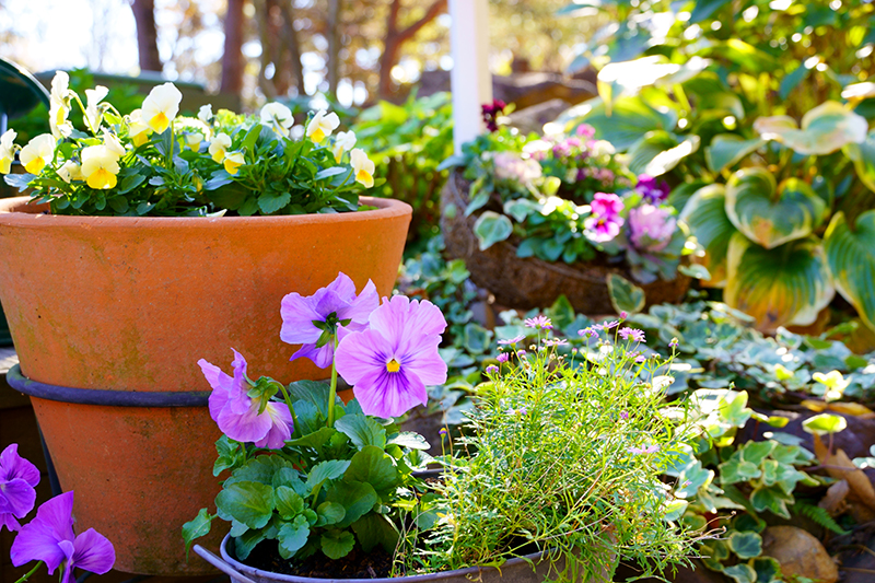 リース以外にも、空いていた鉢にパンジーやビオラを植えて、華やかな庭へと。