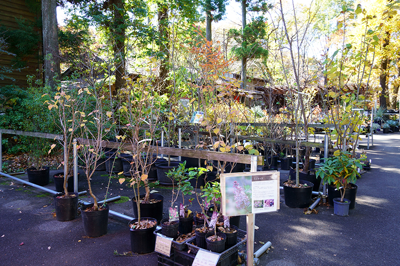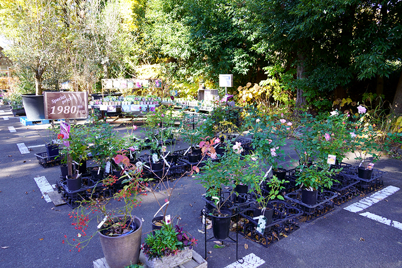 ガーデニングショップの入口前には、樹木やバラの苗木などが数多く並んでいます。