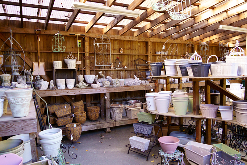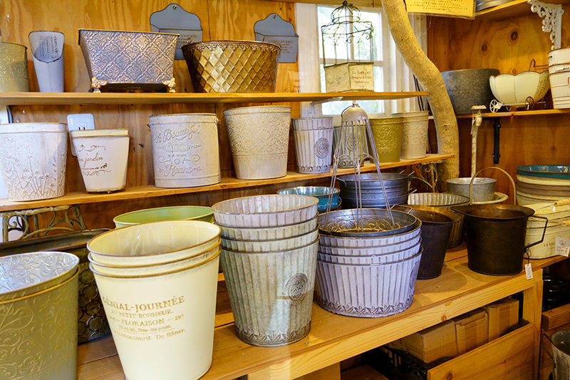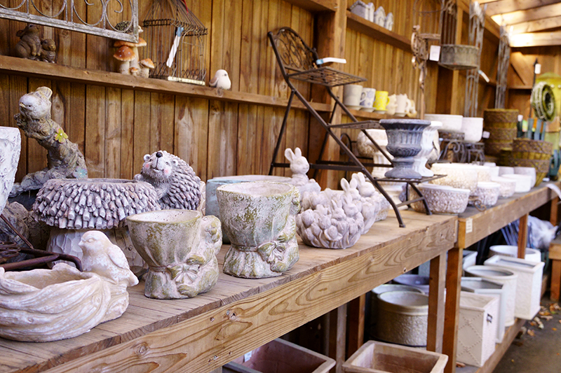 奥には鉢カバーなどガーデニング用品が並んでいます。様々なテイストがあるので、きっと自分好みのものが見つかるはずですよ。