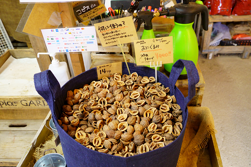 「おにぐるみの殻」が販売されていました。寄せ植えのカバーやお庭の道にまいたりと、こういったアイデアも素敵ですね。