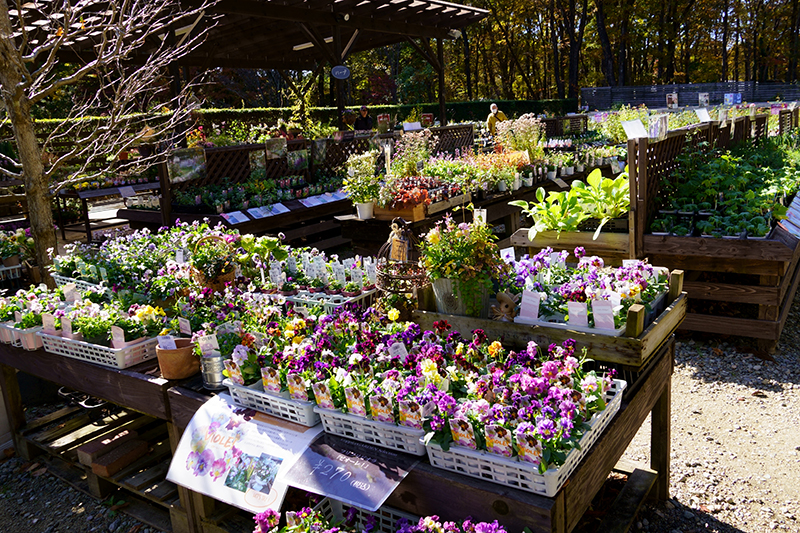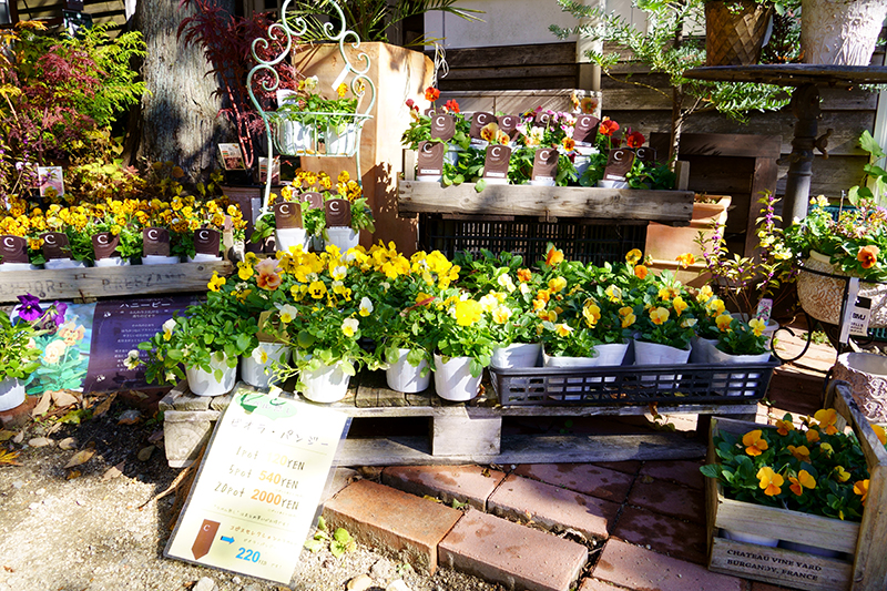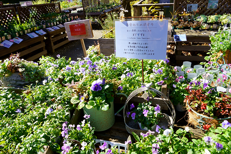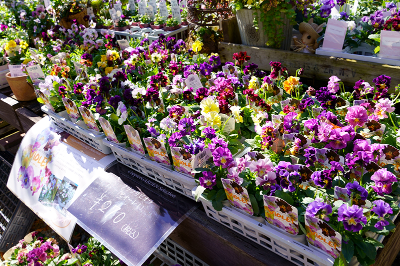 広い売り場には、冬の季節に大活躍してくれるパンジーやビオラがたくさんん並んでいます。