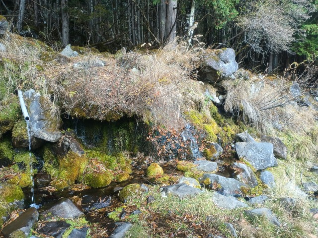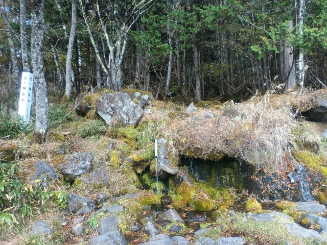 蓼科山の頂上近くに向かうにつれビーナスライン沿いの崖の間のあちこちから水が流れ出ており、女の神氷水はその源水にあたるようです。