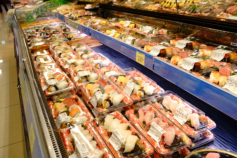 鮮魚店から始まったスーパーということで、魚介類も豊富。お寿司からお刺身など様々な種類が並んでいます。