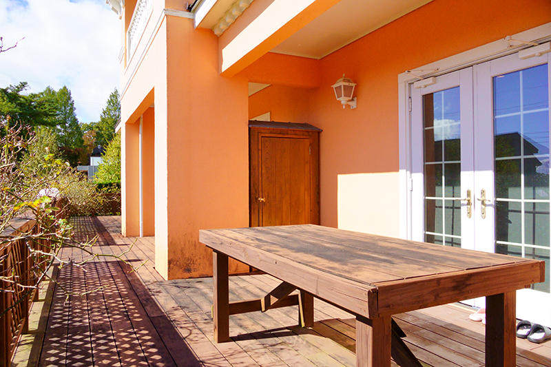 1階にウッドデッキ、2階にはバルコニーがあります。特にバルコニーからは別荘地が見渡せるほど、開放的な景色が広がります。