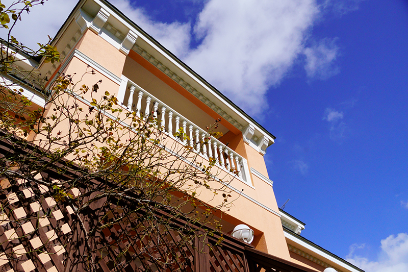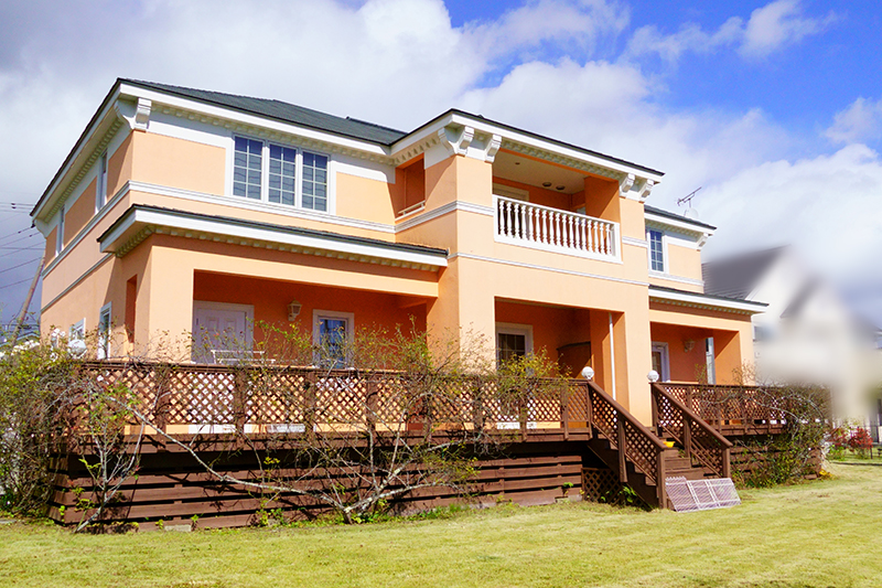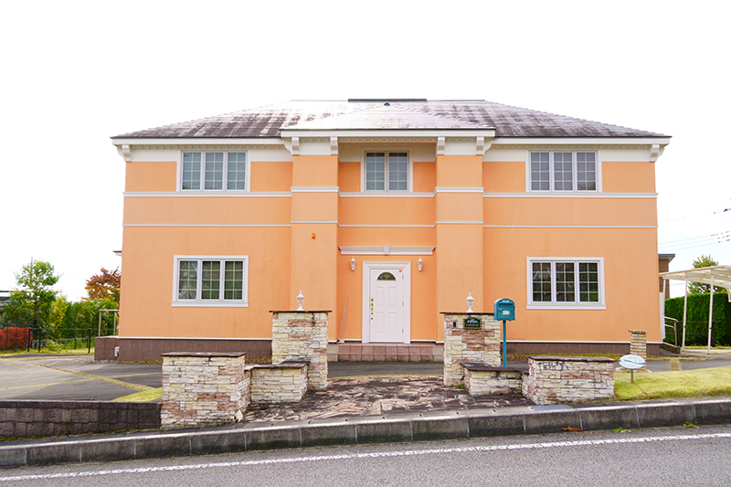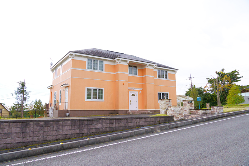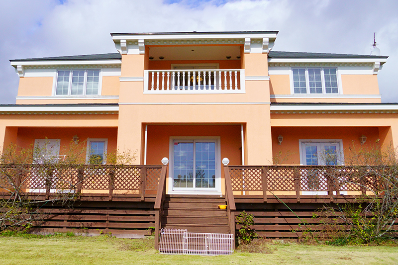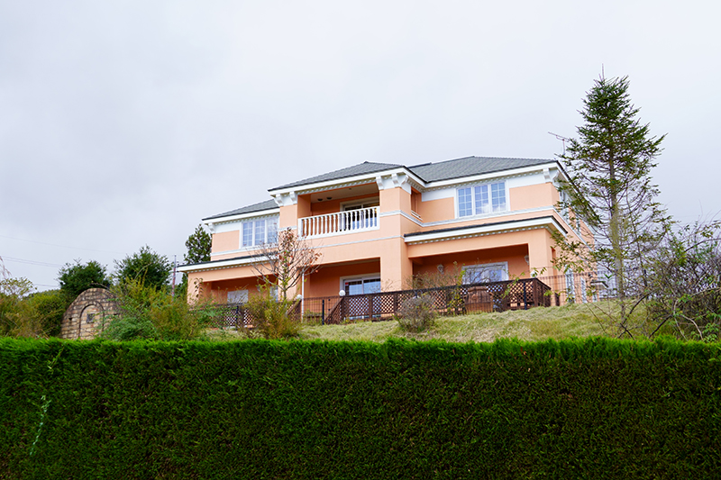 別荘地の高台に建ち、淡いピンクオレンジの外観がひときわ目を引く建物です。存在感、重厚感あふれる造りになっています。