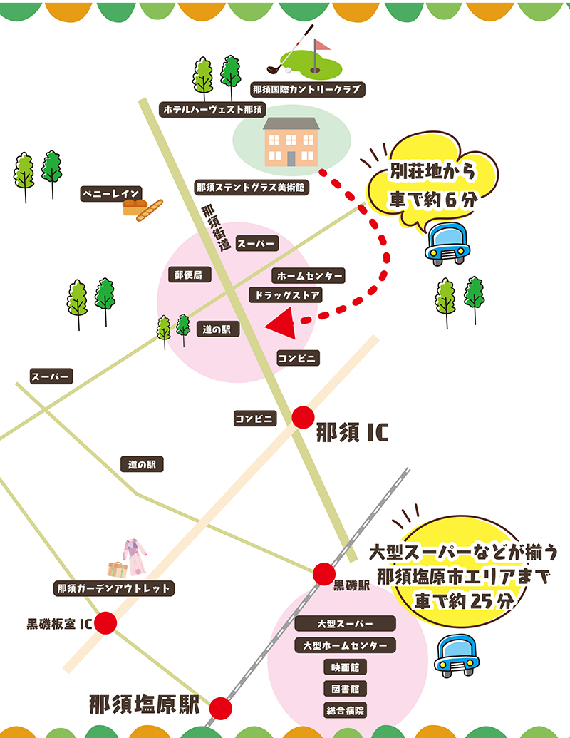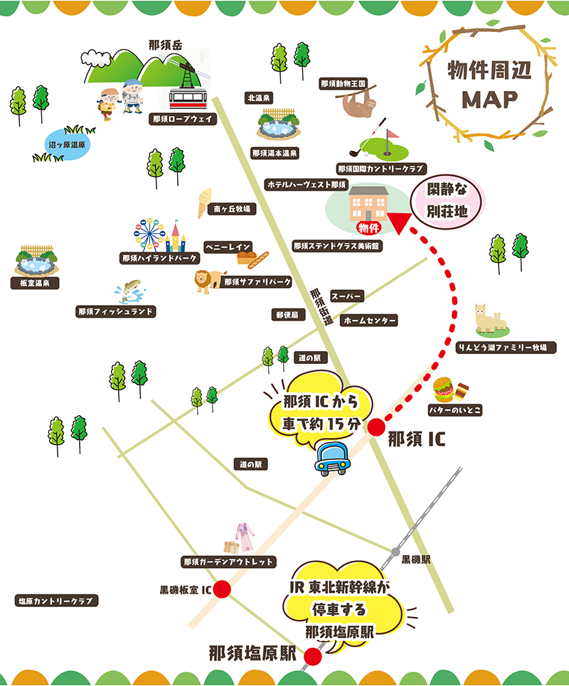 別荘地までのアクセスは、JR東北新幹線「那須塩原」駅より車で 約30分( 約20km)、東北自動車道「那須」ICより車で 約15分 (約9km)になります。