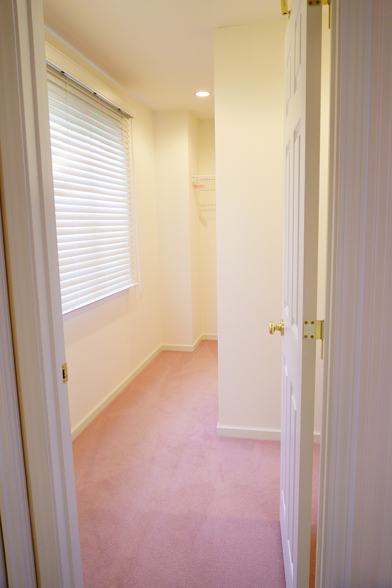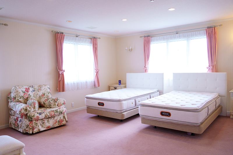 白とピンクを基調とした、約16.7畳の主寝室があります。