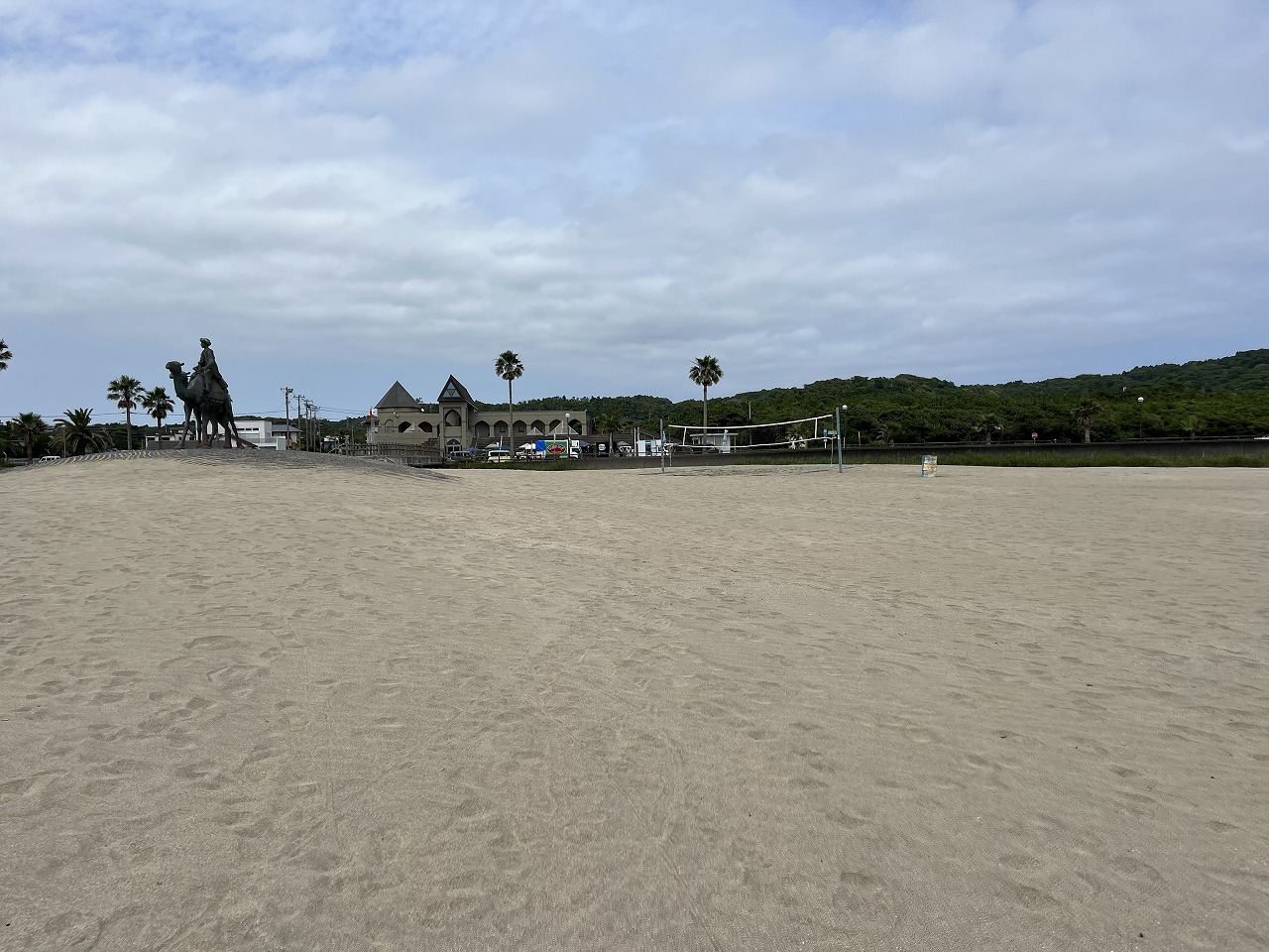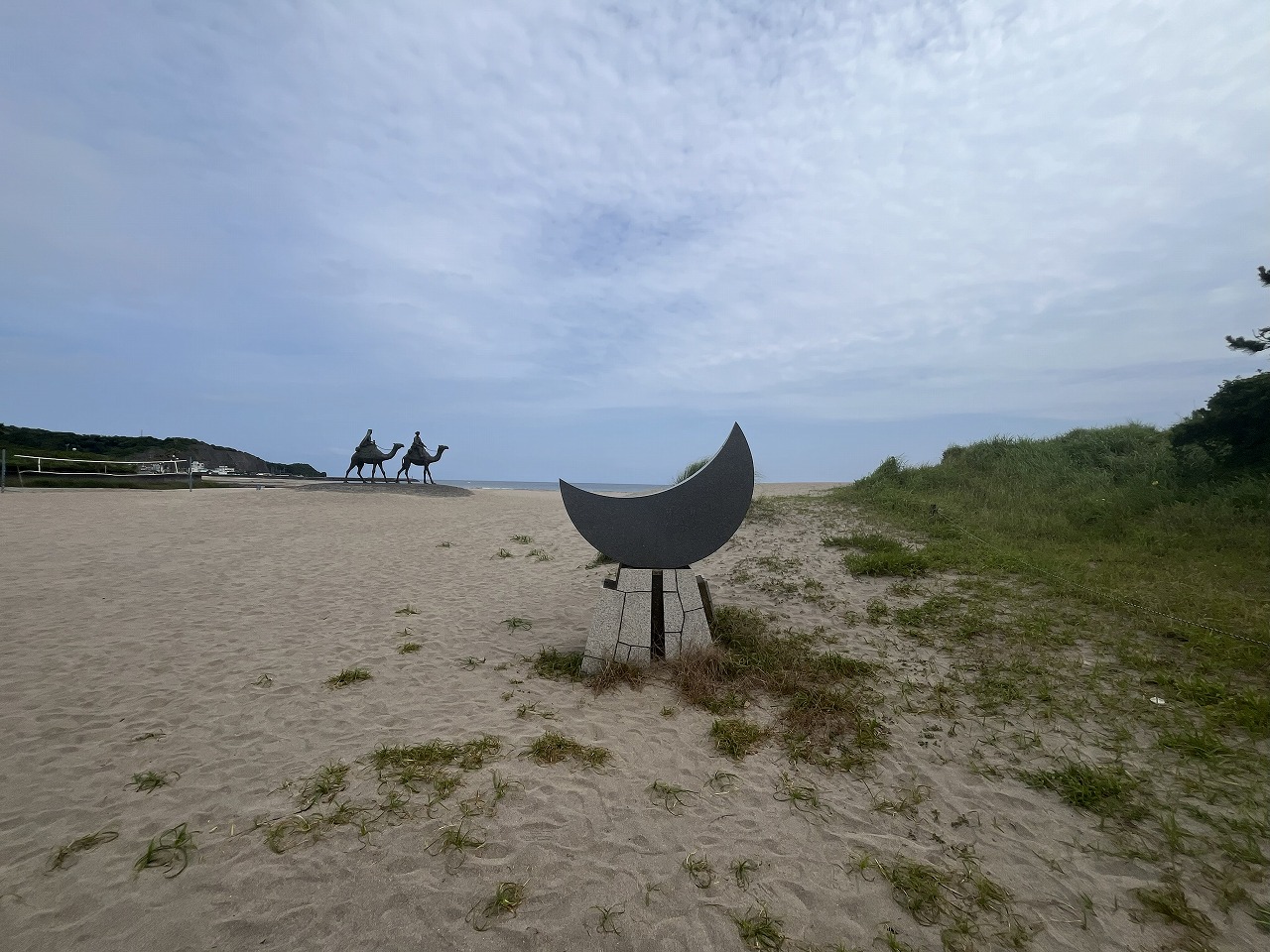 ラクダに乗った王子と姫の銅像が砂浜の上にあり、他ではなかなか出会えない景色を作り出しています。