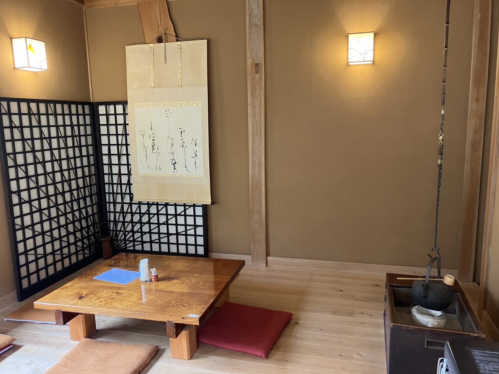 食事をする部屋が幾つかあり古民家風の部屋に格子の建具飾り、古い卓上囲炉裏など有り食を楽しめます。