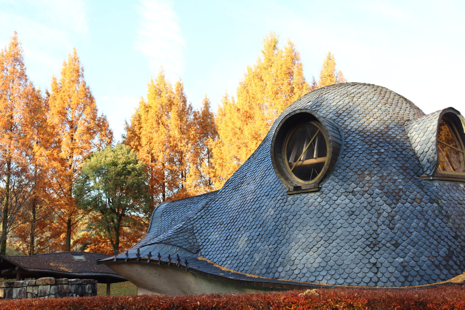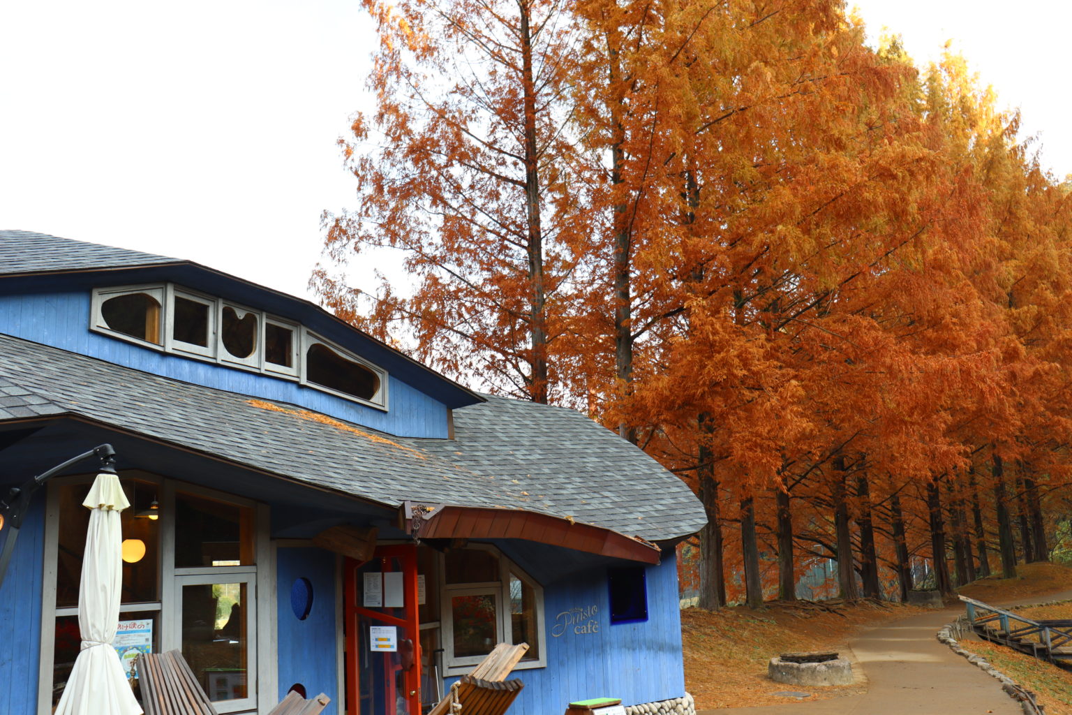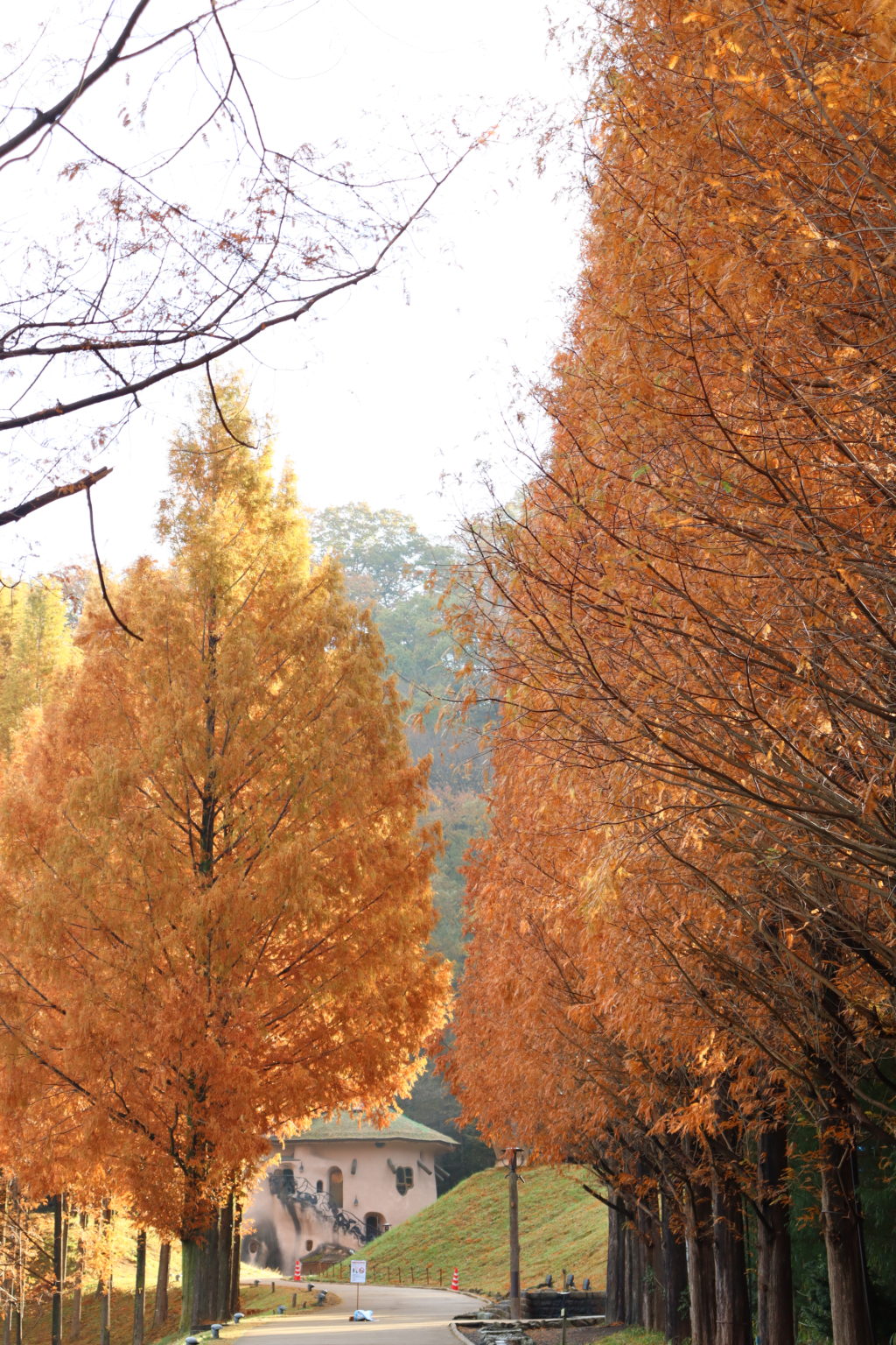 ムーミン谷のメタセコイヤ並木が一斉に色付き、