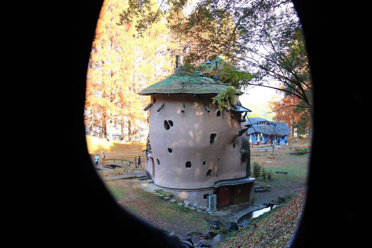 園内に架かる橋の窓からきのこの家を撮った一枚。