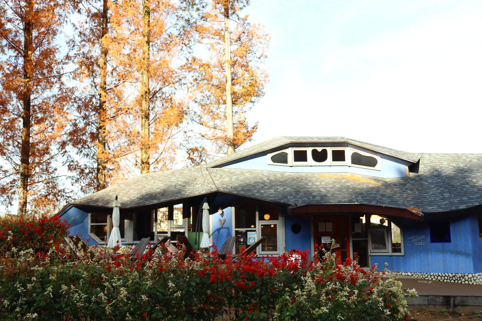 建物の水色と周囲のメタセコイヤ並木のコントラストがきれいすぎて
