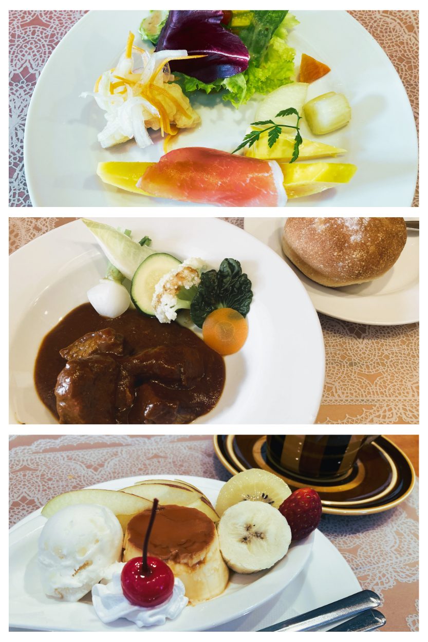 前菜・サラダ・スープからひとつを選び、メインの料理、デザート、ドリンクがセットになっています。前菜の、「パパイヤの生ハムのせ」が絶品! メインのビーフシチューもこっくりとした味わいでした。調理からサービスまで店主がおひとりでこなしているのですが、一杯ずつハンドドリップで淹れているという食後のコーヒーにいたるまで、すべてのメニューに真心が感じられました。