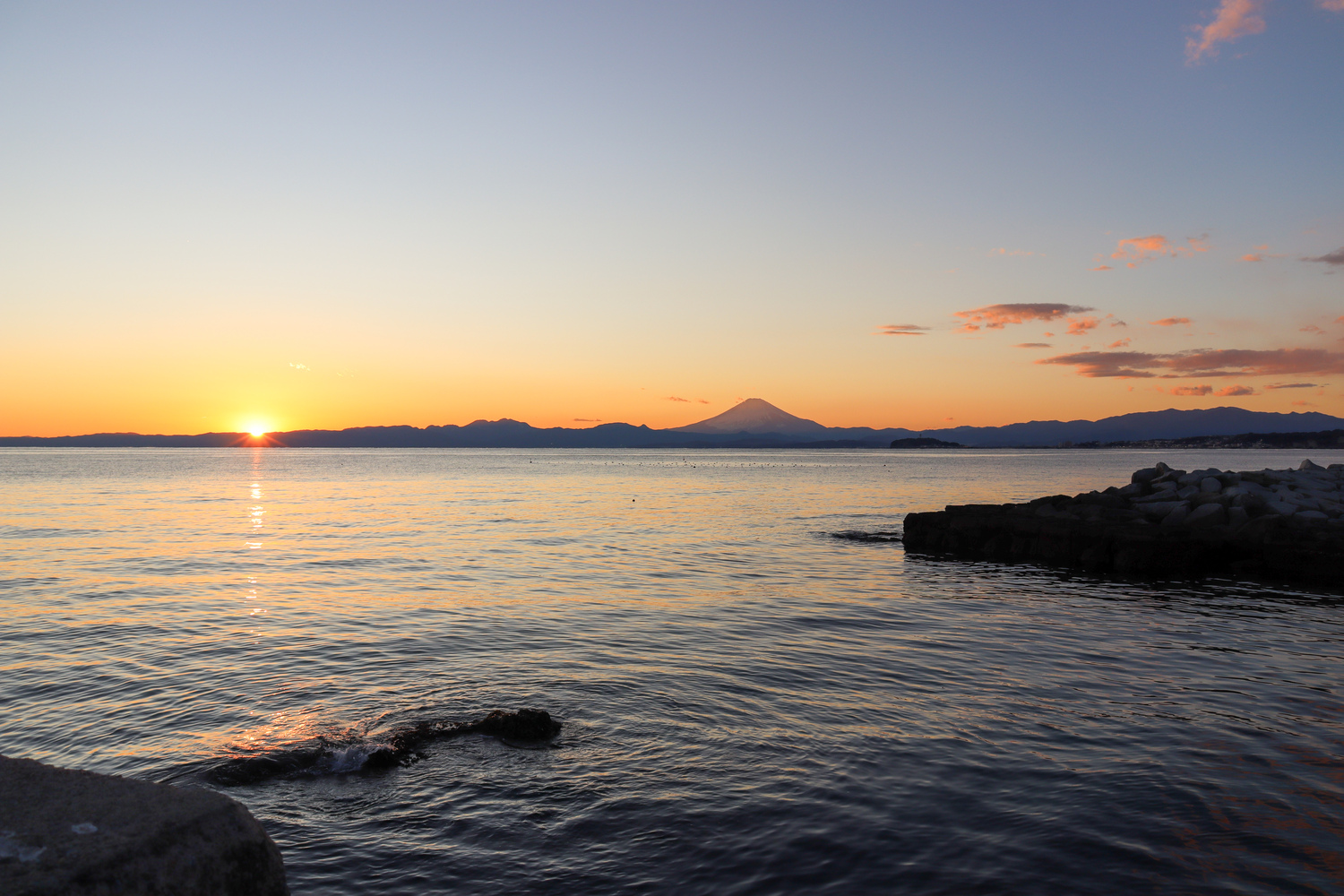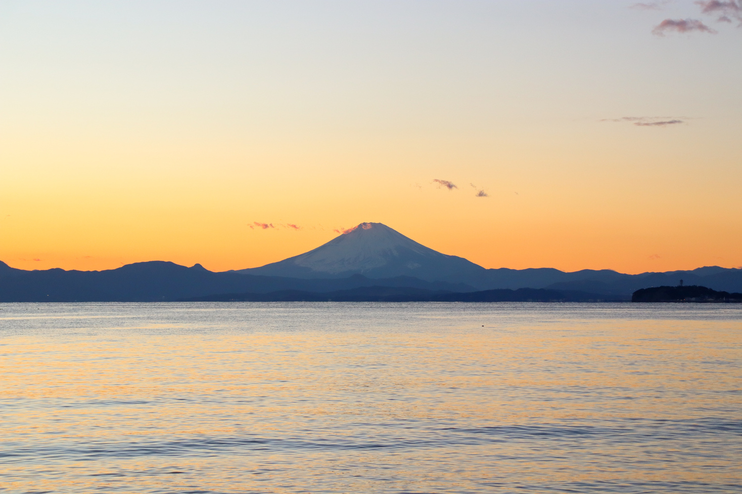 海と富士山をオレンジ色に染めつつ沈みゆく夕陽を眺めましょう。